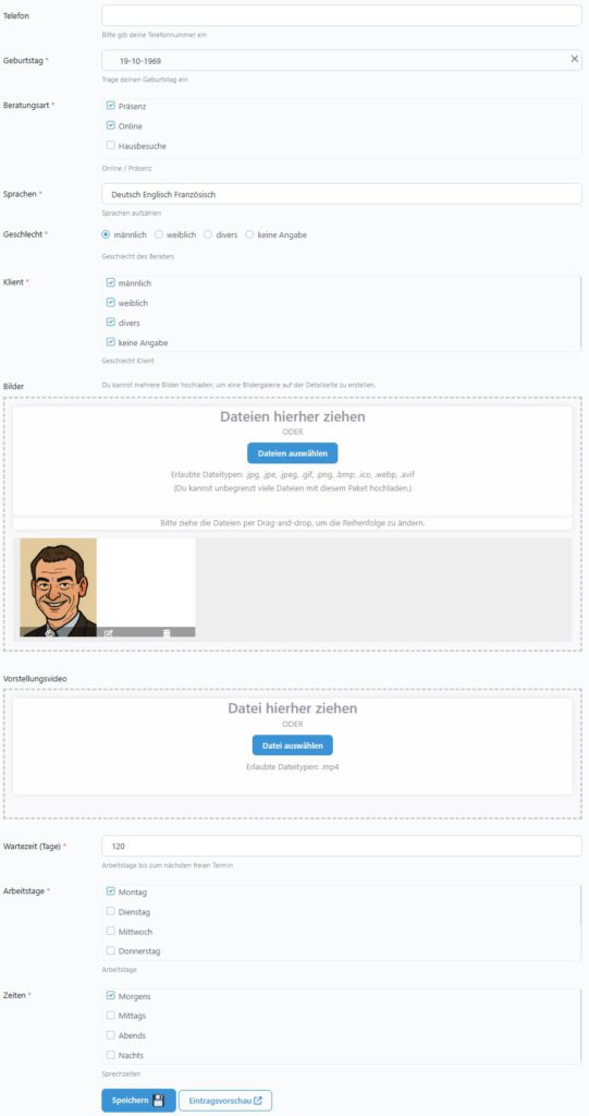 Deine Beratungsart und Sprachen festhalten.